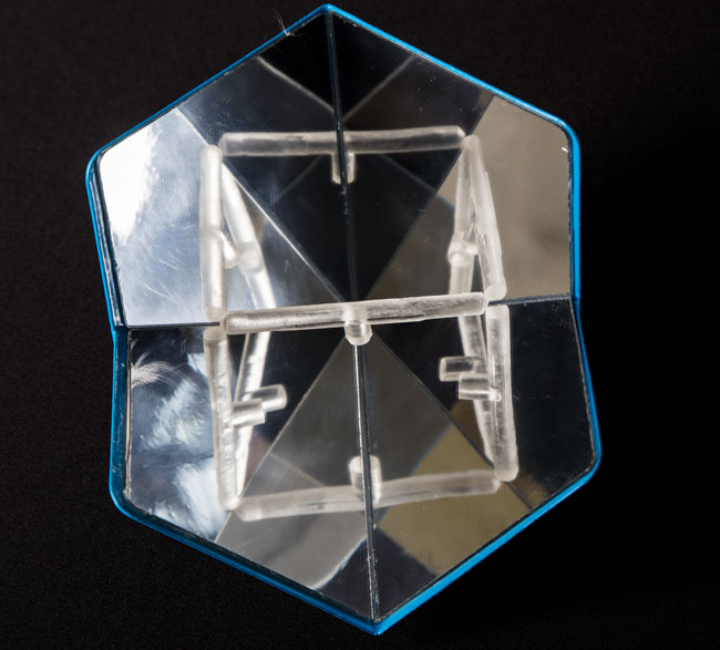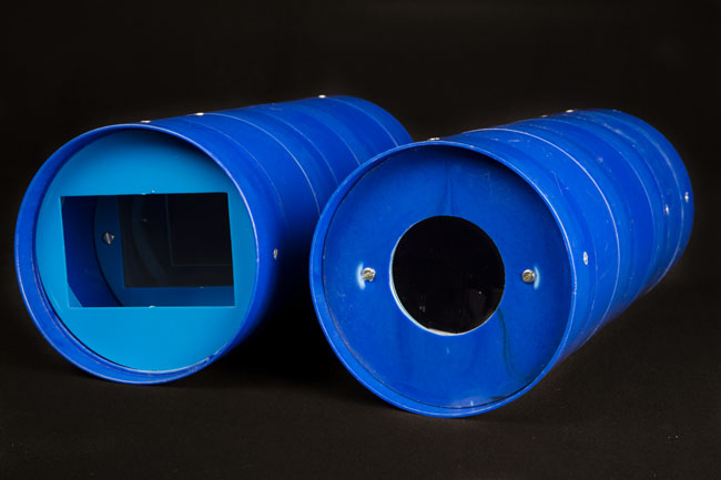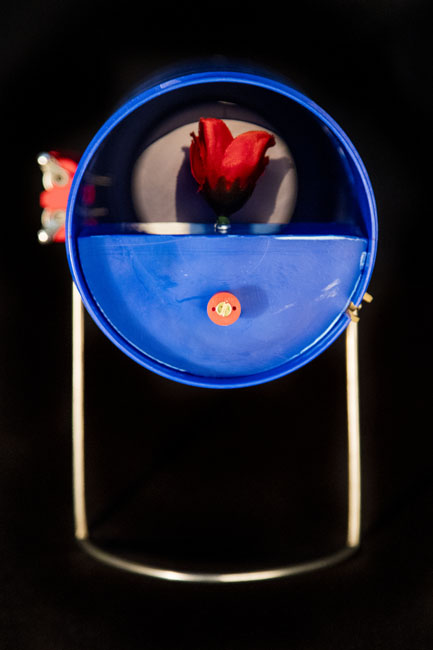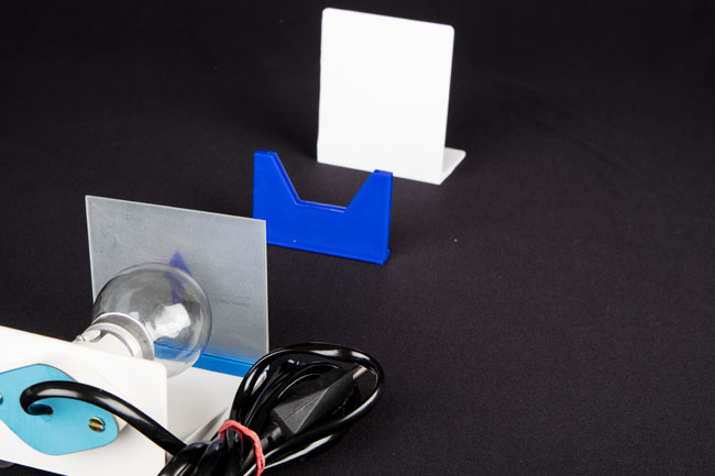 Apparatus consist of concave mirror fitted at one end of a plastic tube. The other end of the tube is open. A small flower fixed in another small metal assembly is placed at the open end of the tube. This flower assembly can be moved in and out so as to change the position of the object. |