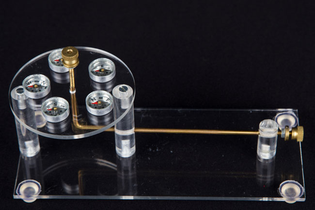| Useful for the study of the direction of the magnetic field around a straight conductor carrying current. The apparatus comes with a 'L' shaped brass rod fixed on a plastic base, with circular plastic plate around the vertical portion of the bar. The ends of the rod are provided with connecting leads. By placing small compasses near and around the vertical portion of the rod (on the circular platform), and passing current through the rod one can study the direction of the filed around the Straight conductor. |  |  |  |