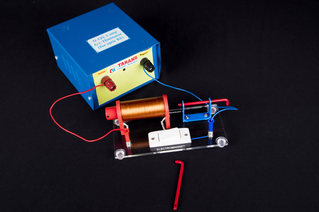 | This model allows you to see the action of an electromagnet. When the 'L' shaped 4 mm red coloured iron rod is placed in the alumminium stand and current is allowed to pass through the copper coil with iron core inside, the coil gets magnetised and becomes electromagnet. As a result, it attracts the iron rod which is in front of it. You can also demonstrate that repulsion is the sure test of magnetism not the attraction in the same model. For that you need to place both 'L' shaped 4 mm rod inside the copper wound coil and allow the current to flow through it.