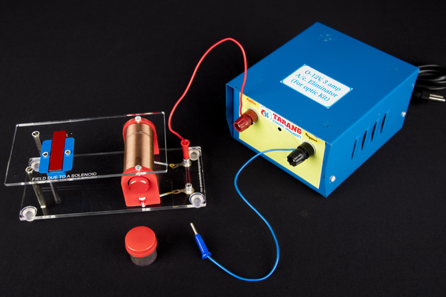 | This model allows you to explore the magnetic field pattern produced by a solenoid (or an electromagnet) when current is passed through it. You can also compare this magnetic field pattern to the magnetic filed pattern produced by a bar magnet. Sprinkle iron filing on the platform above bar magnet and tap it gently. You will get a fired pattern due to bar magnet. Now sprinkle iron filing on the platform above the solenoid and pass current (12v, 3amp) through the solenoid. The iron filings align according to the direction of the field.