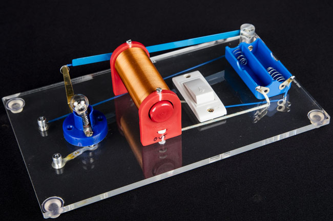 | This model demonstrates how switching one circuit causes one or more other circuits to be switched. When you push the bell push button, the first circuit is complete and the steal strip will be attracted towards the electromagnet. This make the strip to touch the bare wire. As a result the second circuit gets completed and the bulb in the second circuits glows. |  |  |  |